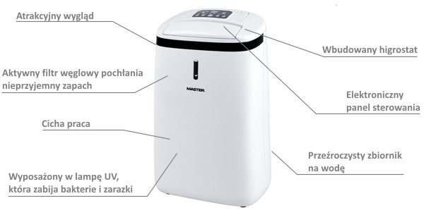 Osuszacze powietrza MASTER DH 720 to urządzenia mobilne, które znajdują zastosowanie w różnego rodzaju pomieszczeniach, takich jak pomieszczenia mieszkalne, łazienki, garderoby, piwnice, spiżarnie, schowki, domowe biblioteczki czy archiwa. Usuwają wilgoć z pomieszczeń oraz zapobiegają powstawaniu pleśni i grzybów. Aktywny filtr zapobiega przykrym zapachom.